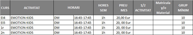 Emotion Kids és una activitat extraescolar que potencia el desenvolupament de la intel·ligència emocional dels alumnes, on aprendran a gestionar les emocions i els sentiments i incrementaran la seva autoestima. Aprendran a ser més feliços. Ensenyem eines per a la vida: Gestió de les Emocions, Habilitats Socials, Autoregulació, Motivació, Empatia i Autoconeixement.
